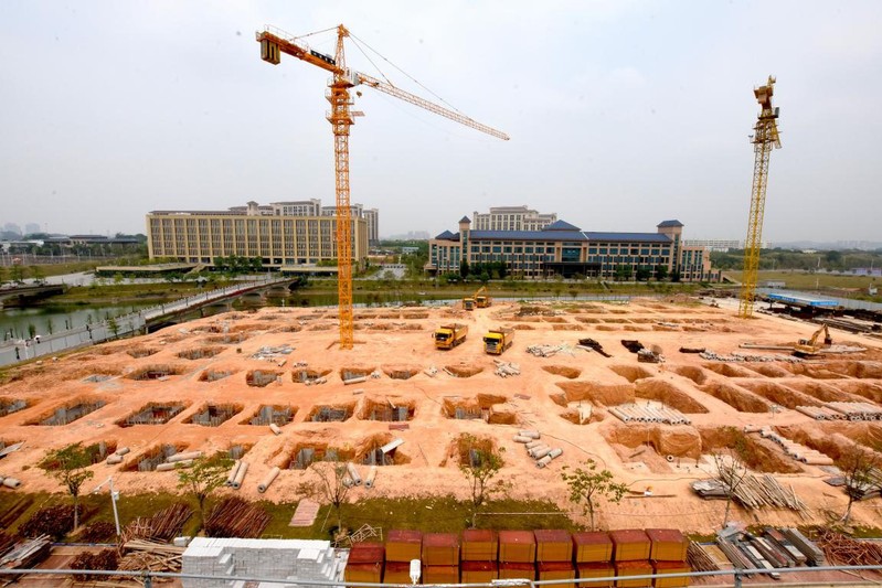 日前,番禺校区镜湖南侧正如火如荼地进行施工建设。据学校基建处介绍,番禺校区在建的实验楼F组团目前已取得施工许可证,完成场地三通一平,临设、塔吊搭建以及工程桩工程。其中F1栋为mg4355电子线路的实验楼,已完成基础承台钢筋混凝土施工。