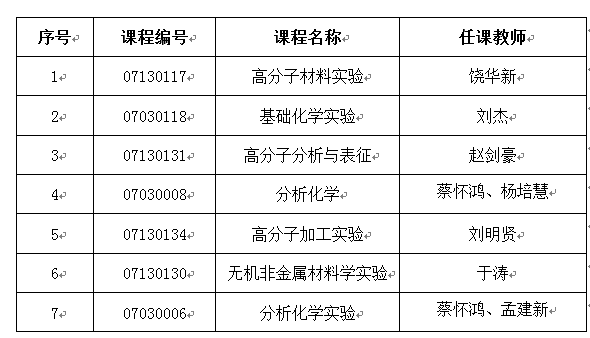 2018-2019学年第二学期,学校教务处组织全校学生进行了课程评估。mg4355官网共开设有63门课程,其中《高分子材料实验》(任课教师:饶华新)等7门课程获评优秀,现将优秀课程名单予以公布:
