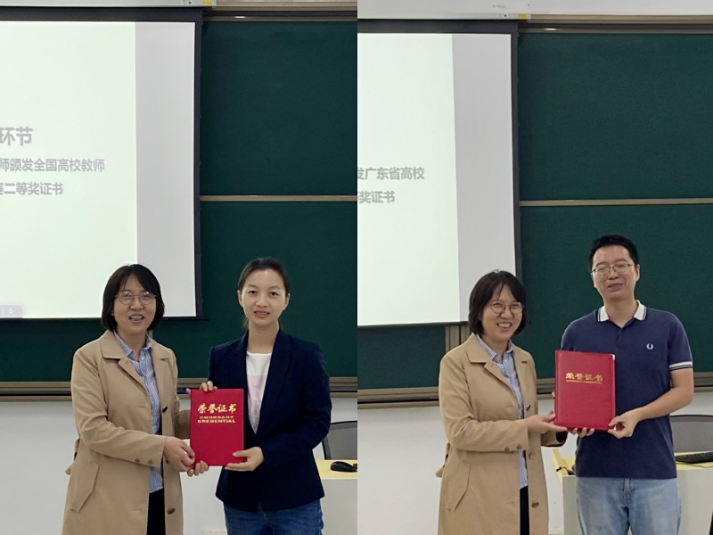 邵桂珍在开幕式上为获得今年全国高校教师教学创新大赛的鲁路老师及获得广东省高校青年教师教学大赛的宁国宏老师颁发获奖证书。她讲到,这两个竞赛证书分量十足,意义重大,希望全院教师以两位老师为榜样,热爱教学、钻研教学,不断提升教学能力。