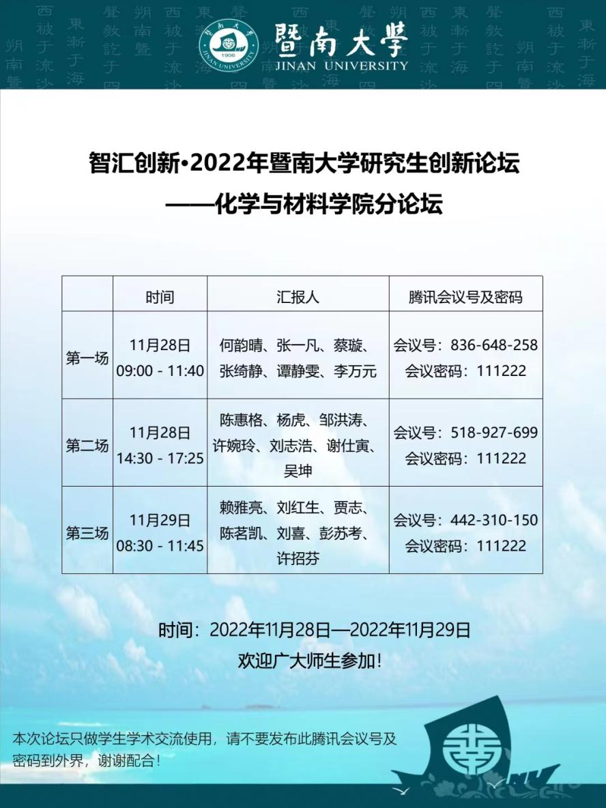 为促进研究生学术研究及创新实践的交流与互动,展示mg4355电子线路研究生风采和高水平创新成果,提高研究生的学术素养、开拓研究生学术视野、营造浓厚的学术氛围。由mg4355电子线路研究生院主办,mg4355电子线路承办的“智汇创新.2022年mg4355电子线路研究生创新论坛--化学与材料学院分论坛”定于2022年11月28日-29日以腾讯会议形式线上举办。