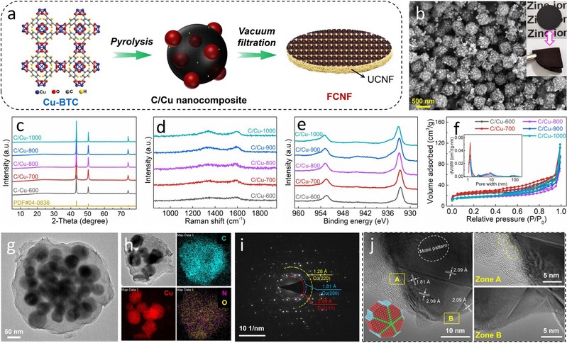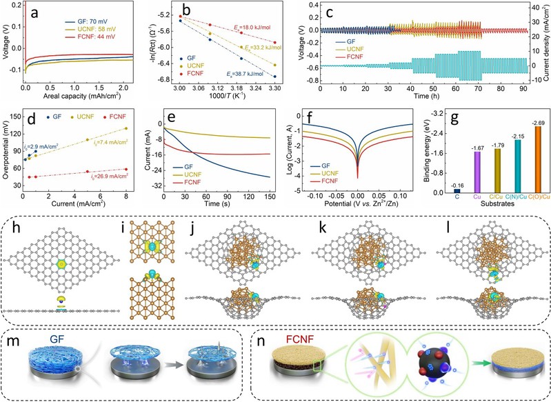 鉴于此,本工作通过在低厚高强纤维素纳米纤维膜(CNF)基底表面设计MOF衍生的C/Cu纳米复合修饰层实现了厚度仅23 µm且具有优异锌负极稳定能力的功能性超薄隔膜(FCNF)。CNF膜基底的纳米孔结构、超低厚度和离子筛分功能有利于锌离子快速而均匀的传输,而高比表面积C/Cu纳米复合修饰层的锌亲和能力(特别是含杂原子C/Cu界面显示出高度亲锌特性)为锌沉积提供丰富低势垒形核位点、改善锌沉积动力学,二者协同调控锌沉积界面化学,从而实现锌负极稳定和超薄隔膜的持久耐用。本研究不仅为稳定锌负极提供了新的策略,同时为水系锌离子电池超薄隔膜的设计提供了理论借鉴。