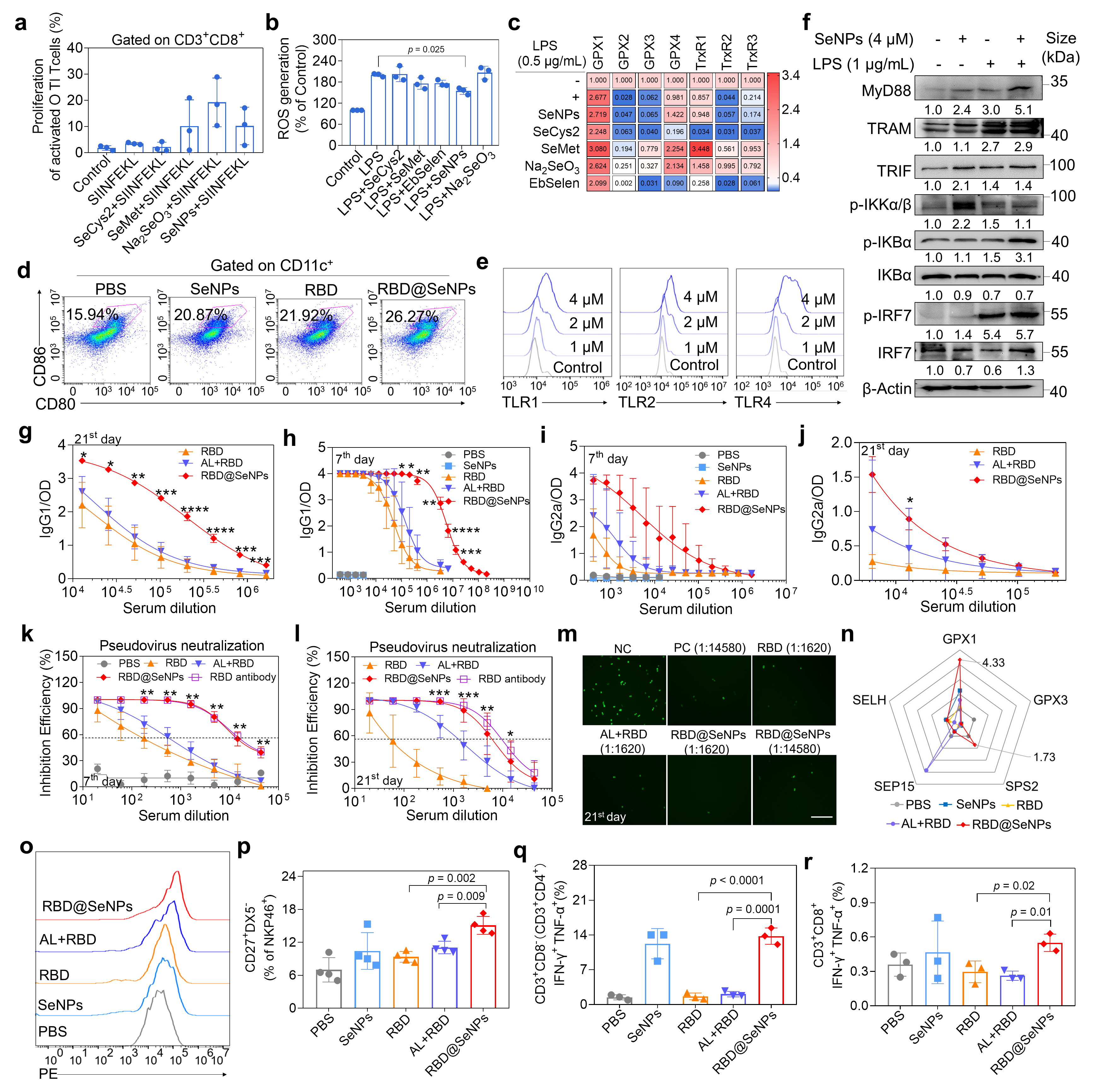 图2 功能化纳米硒(RBD@SeNPs)诱导强效天然免疫、细胞免疫和体液免疫反应。